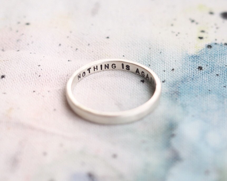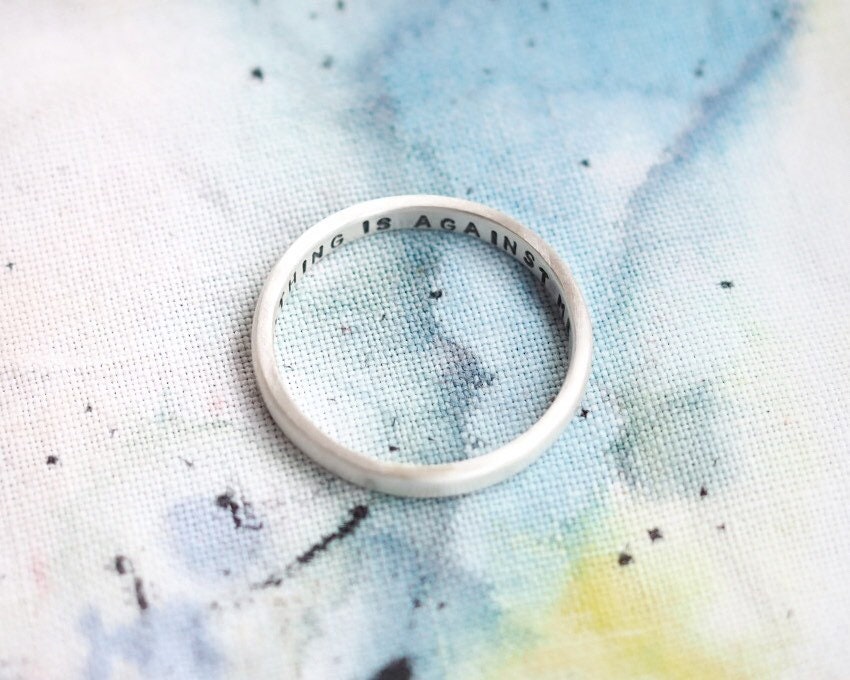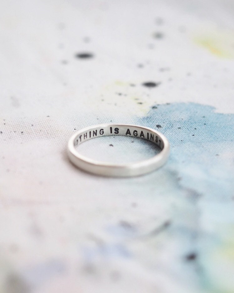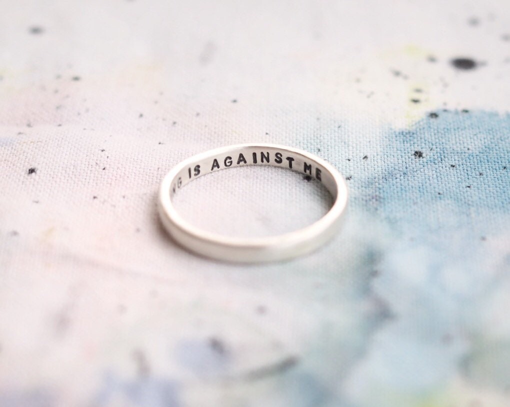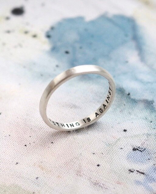 A modern reimagining of the classic Posey Ring, which were rings that were given as gifts with written messages on the inside of the band. This one is hand stamped with the positive affirmation ‘nothing is against me’ but you can personalise with your own wording inside the ring too. This 2mm wide silver ring is also perfect for stacking.