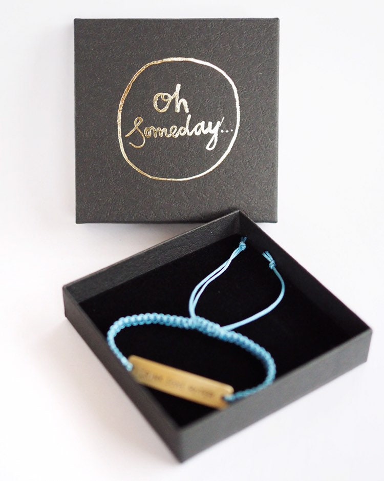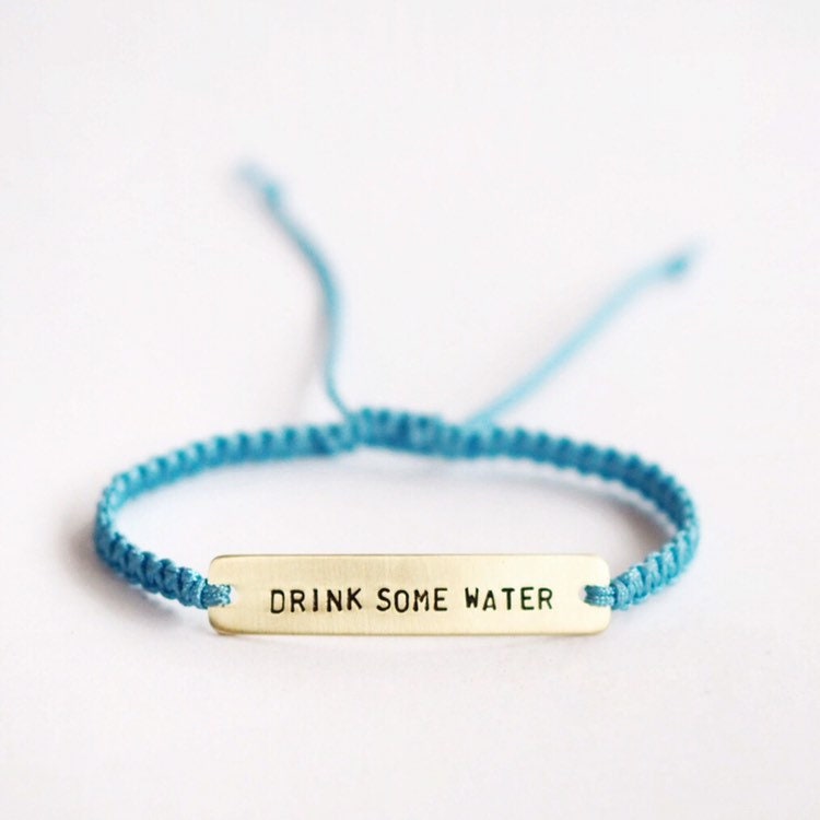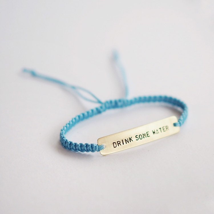 A macramé bracelet with a sterling silver or brass piece with the words 'Drink Some Water' hand stamped on it