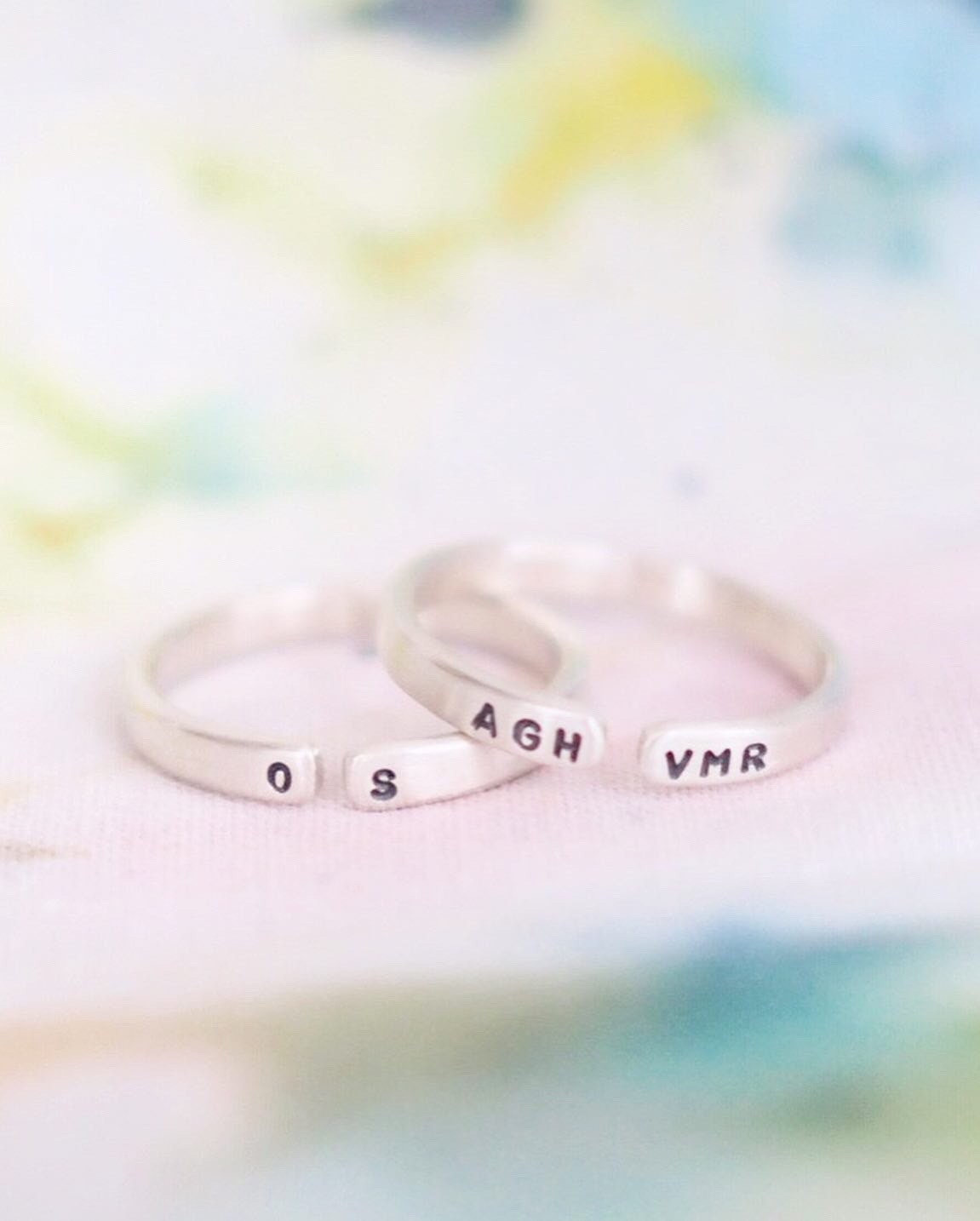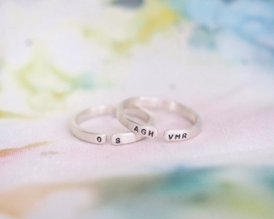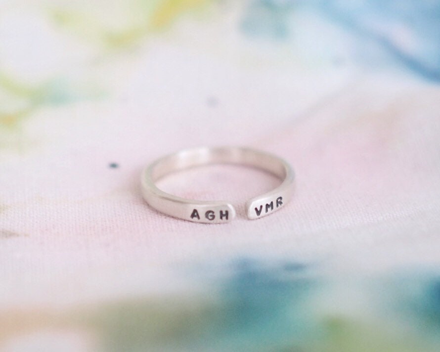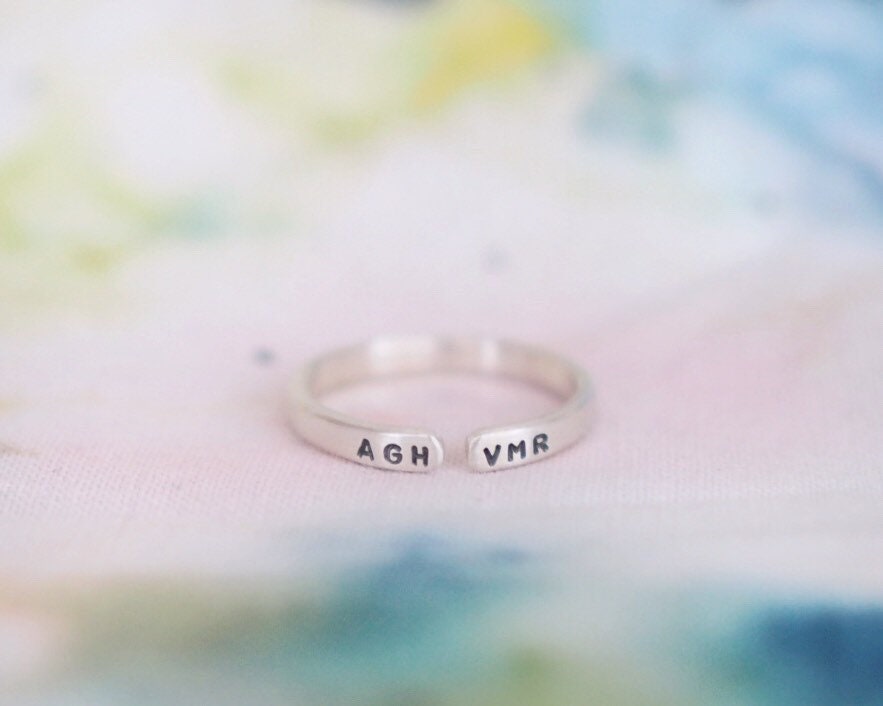 Add up to four initials on either side of the opening in the ring. It is made from 2mm wide sterling silver, and has been hand forged and hand stamped with tiny 1mm letters. It's perfect for stacking too!