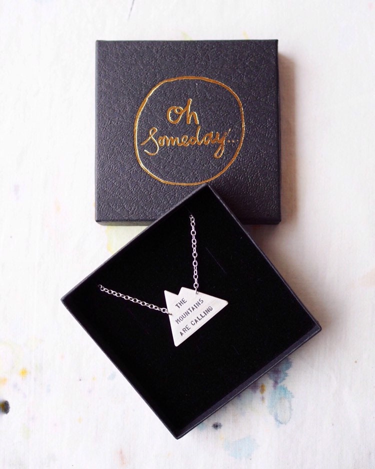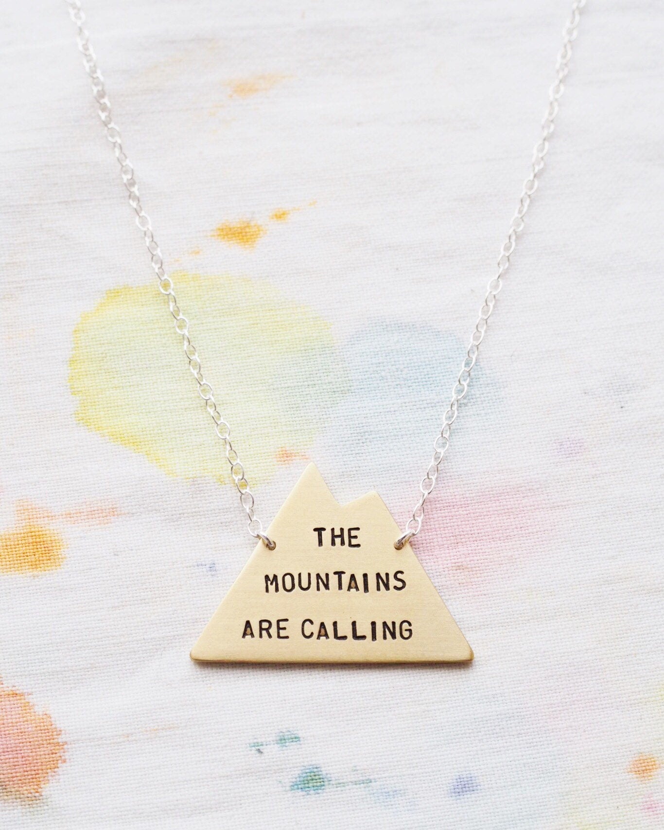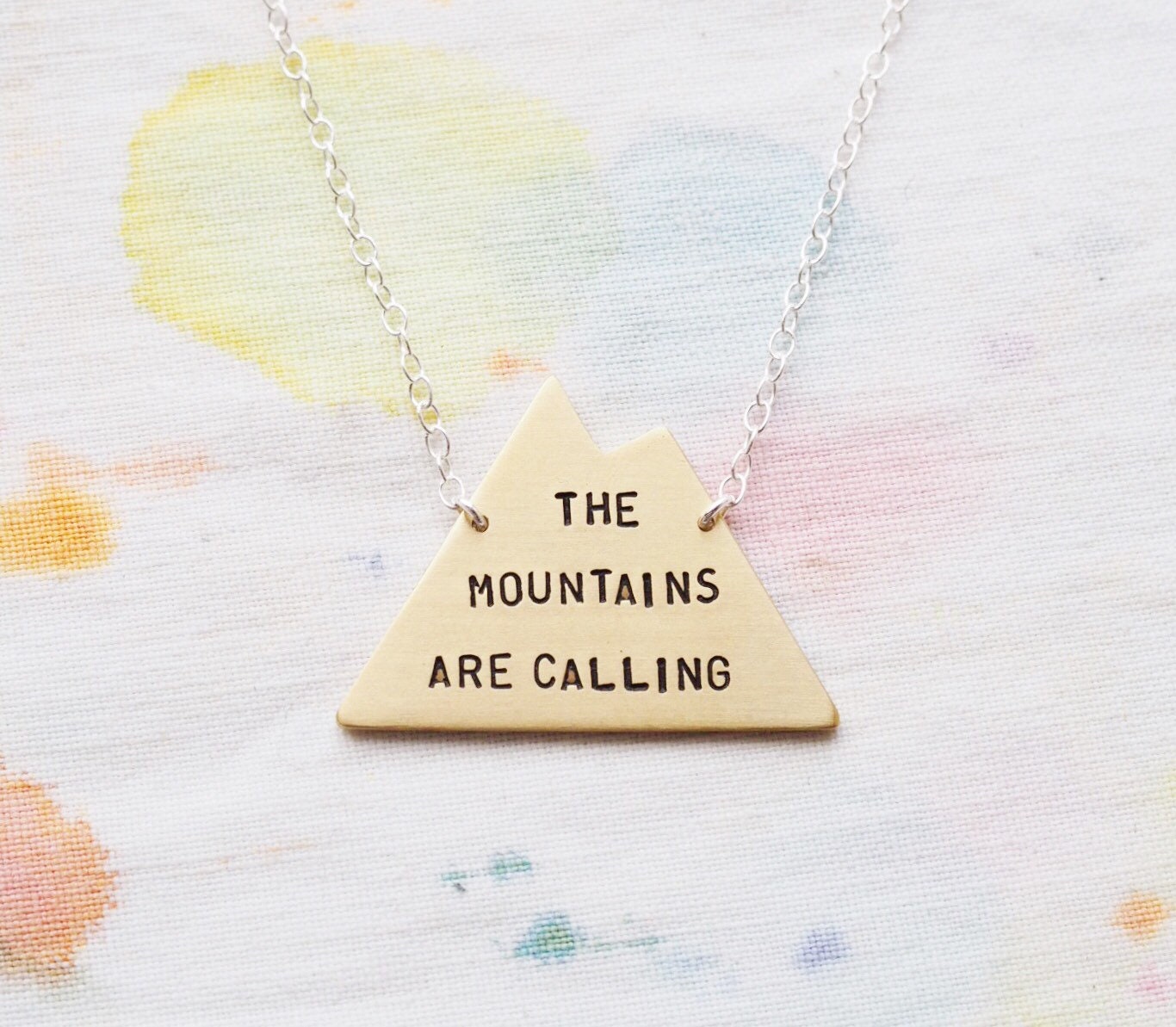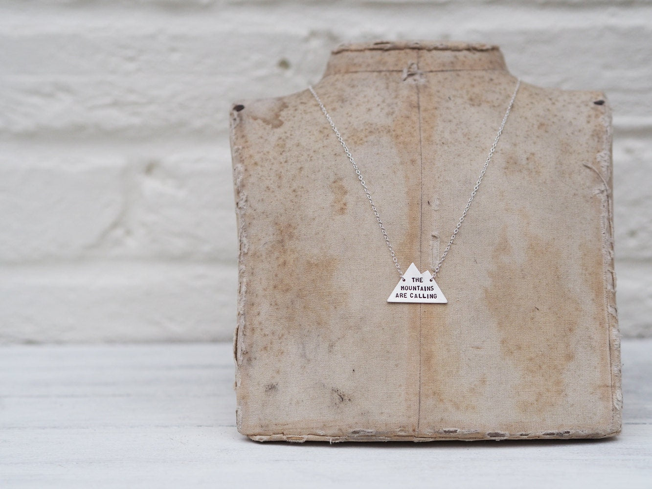 This necklace is made from a brass or sterling silver mountain shaped pendant with a satin finish, hand sawn and hand stamped, with the words 'The Mountains Are Calling' on it, it can also be personalised with your choice of wording. It hangs on a silver chain that is The pendant is 1"/ 2.5cm in diameter.
